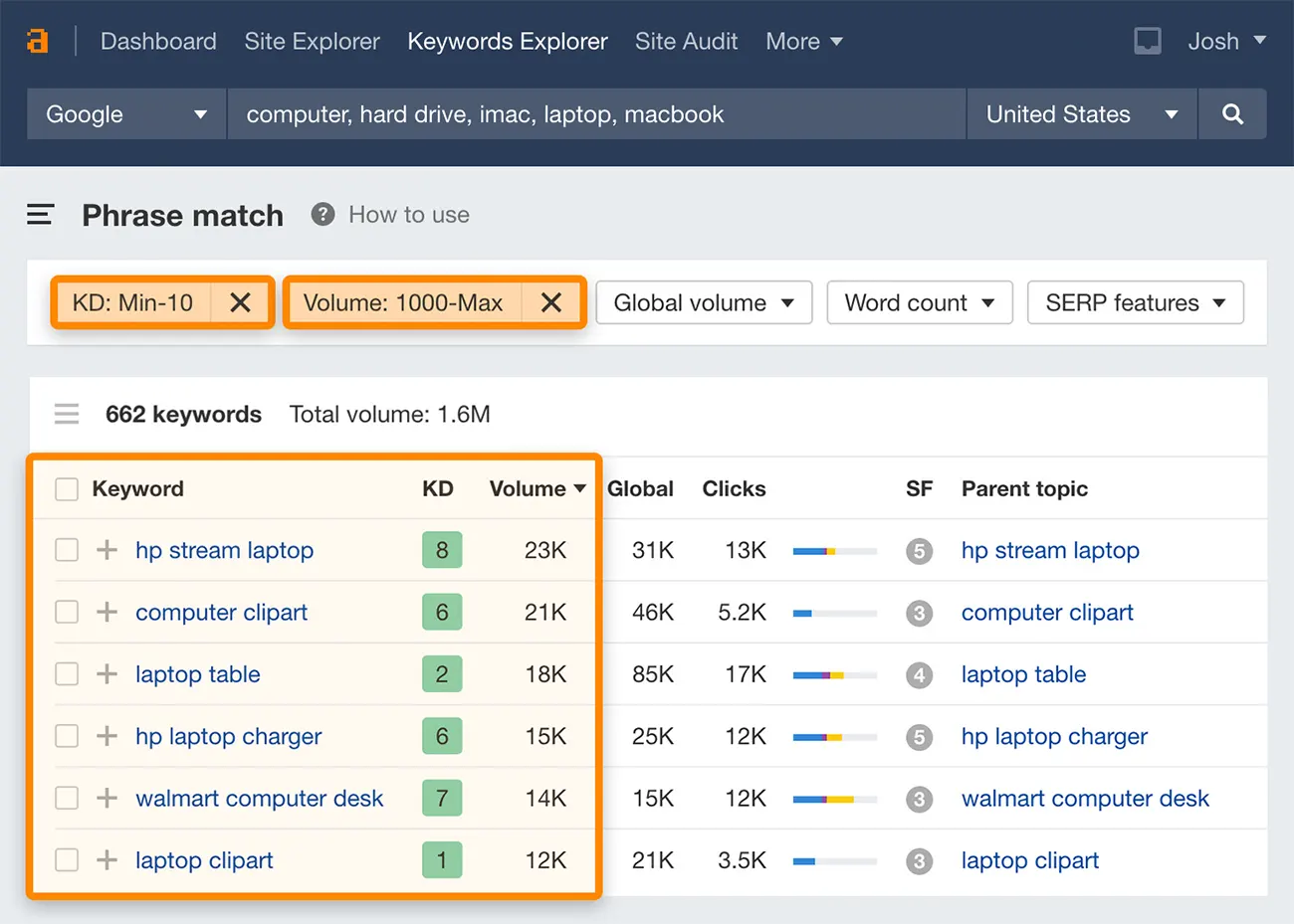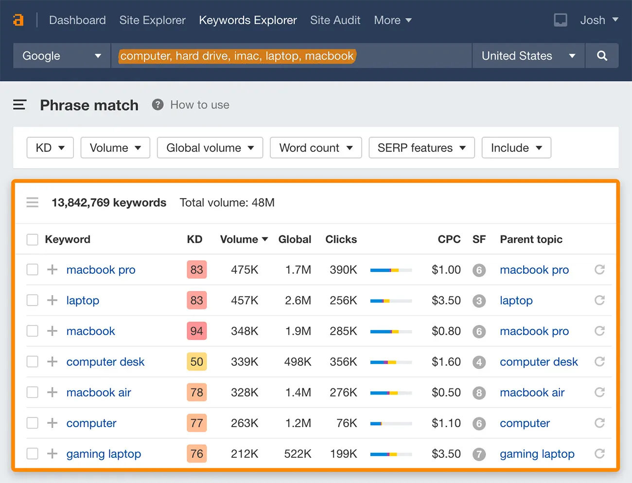 ایدههای موضوع خود را به ابزار جستجوگر کلمات کلیدی مانند Ahrefs’ Keywords Explorer متصل کنید، سپس به گزارش تطابق عبارت بروید. ایدههای کلیدواژه شامل یک یا چند کلمه و عباراتی را که وارد کردهاید، با حجم جستجوی ماهانه و سایر معیارهای سئو Seo metrics میبینید.