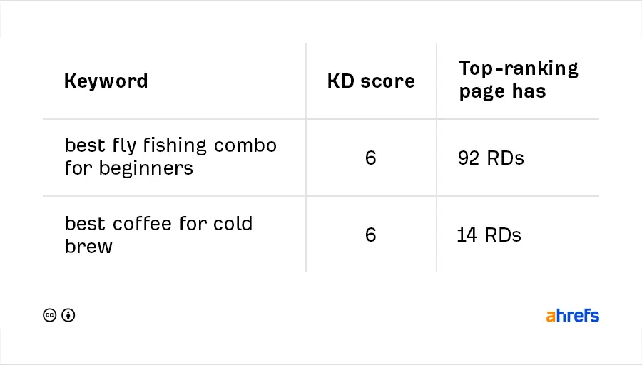 در نتیجه، اگر همه چیز برابر باشد، احتمالاً بهتر است صفحه با 92 RD نسبت به صفحه با 14 RD بالاتر باشد. بنابراین علیرغم داشتن نمرات KD یکسان، "بهترین قهوه برای دم کردن سرد" احتمالاً کلمه کلیدی رقابتی کمتری نسبت به "بهترین ترکیب فلای فیشینگ برای مبتدیان" است.