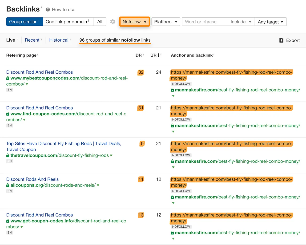 برای صفحههایی با 92 RD، 96 درصد از بک لینکها نوفالو میشوند، که بیشتر آنها از صفحاتی در سایتهای قدرت پایین دارای کد کوپن هستند. آنها همچنین دارای انکرهای URL عادی هستند.