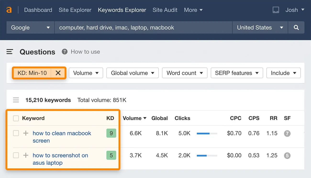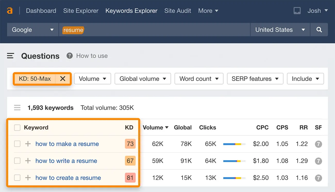 برای یافتن این موضوعات، برخلاف آنچه قبلا انجام می دادید عمل کنید. به جای فیلتر کردن کلمات کلیدی با امتیاز KD پایین، برای کلمات کلیدی با امتیاز KD بالا فیلتر کنید.