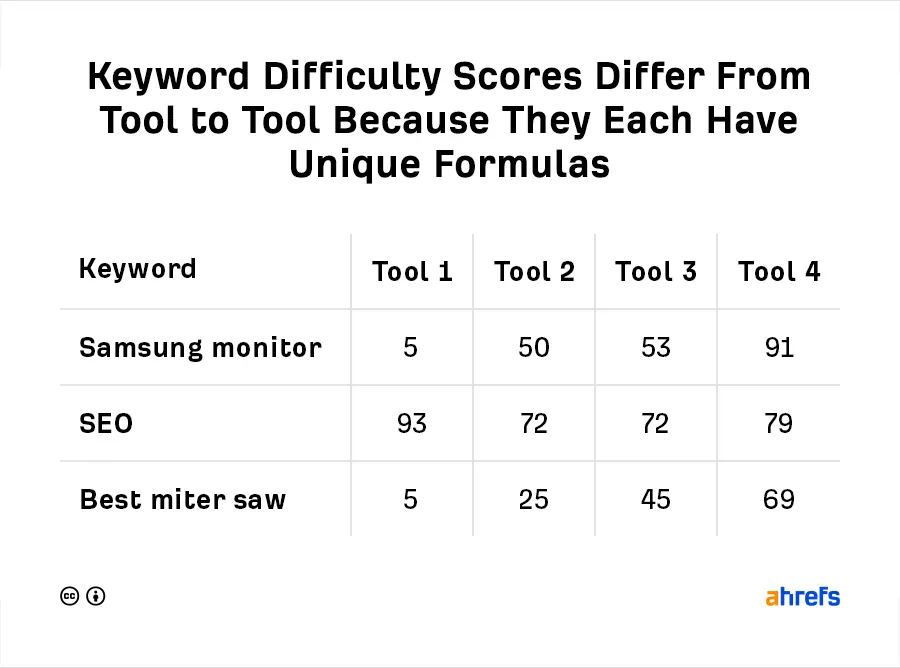 همچنین درک این نکته مهم است که هر ابزار سئو SEO tool از یک فرمول منحصر به فرد برای نمره دشواری کلمه کلیدی خود استفاده می کند، به همین دلیل است که نمرات اغلب کلمات، از ابزاری به ابزار دیگر بسیار متفاوت است: