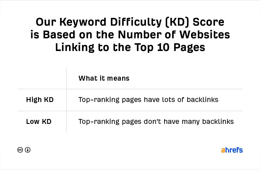 در Ahrefs، محاسبه نمره دشواری کلمه کلیدی ما ساده است: ما یک میانگین مختصر شده از تعداد دامنه های ارجاع دهنده (وب سایت های پیوند دهنده) را که به 10 صفحه برتر اشاره می کنند، در نظر می گیریم. این بدان معناست که صفحات با رتبه بالا برای کلمات کلیدی KD بالا دارای بک لینک های زیادی هستند و صفحات با رتبه بالا برای کلمات کلیدی KD پایین دارای بک لینک های کمی هستند.