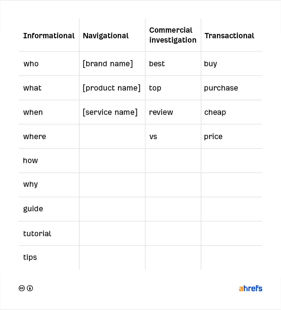 اغلب میتوانید با جستجوی اصلاحکنندههای کلمه کلیدی در پرس و جو، بگویید که کلمه کلیدی شما در کدام گروه قرار میگیرد. اگر حاوی کلماتی مانند «خرید» یا «ارزان» باشد، به احتمال زیاد یک درخواست معامله ای یا تجاری است. اگر حاوی کلماتی مانند «چگونه»، «چه» یا «کجا» باشد، احتمالاً اطلاعاتی است.