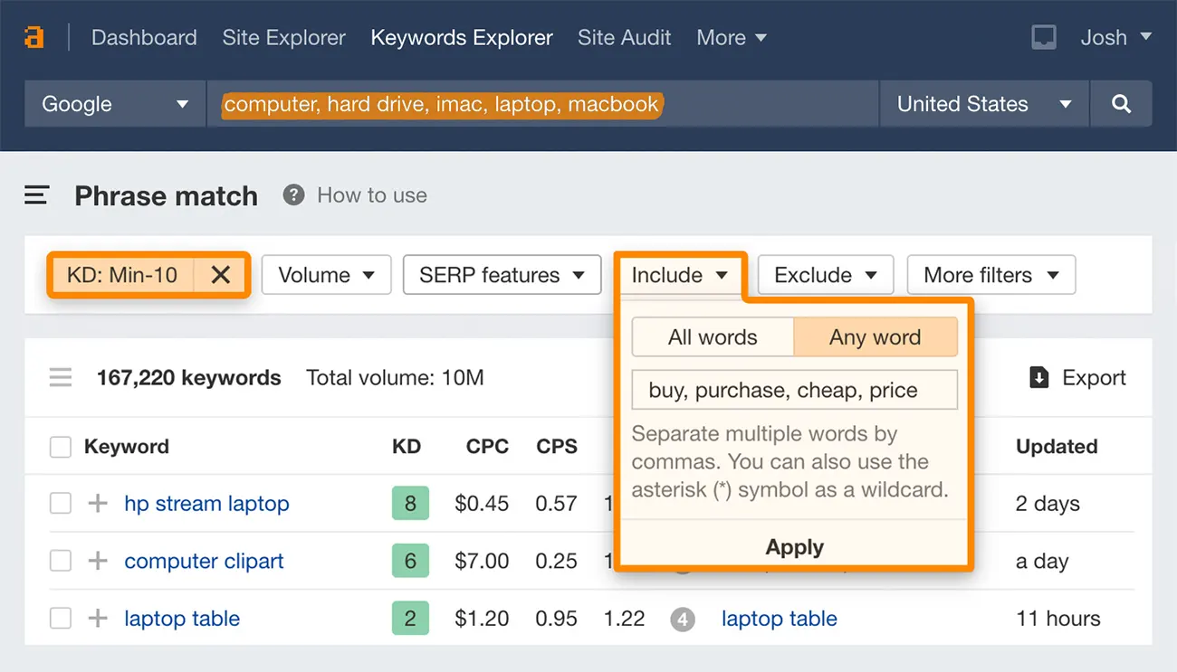 در اکسپلورر کلمات کلیدی Ahrefs، میتوانید ایدههای کلیدواژهای را که در هر یک از این گروه ها قرار میگیرند، با استفاده از فیلتر «Include» پیدا کنید.