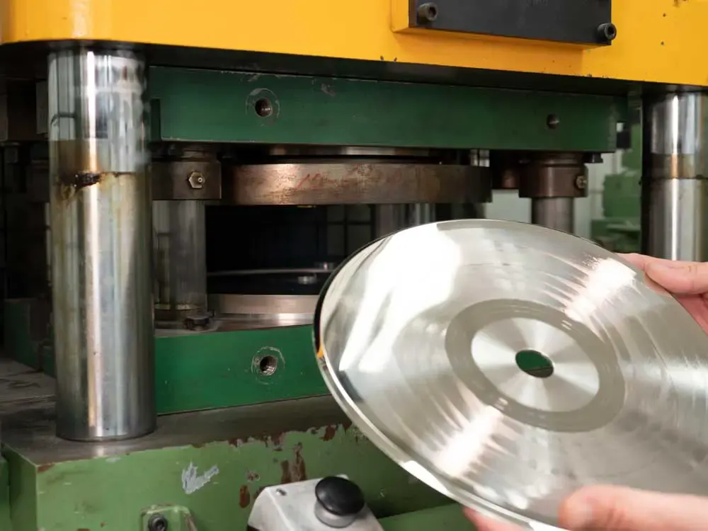 هنگامی که فشار دستگاه دوباره شروع می شود، دو استامپر به هم می رسند و ماده وینیل و لیبل ها را با حرارت و فشار تقریباً 100 تن فشار می دهند. گلوله وینیل صاف می شود و برجستگی های روی استامپرها شیارهایی را در وینیل که هنوز نرم است، ایجاد می کند. در همان زمان، لیبل ها در نقاط مربوطه خود در مرکز پرس می شوند.