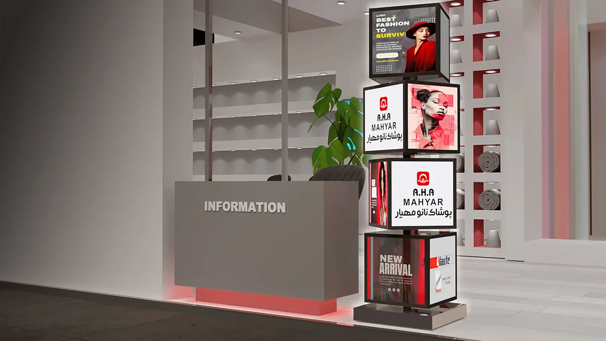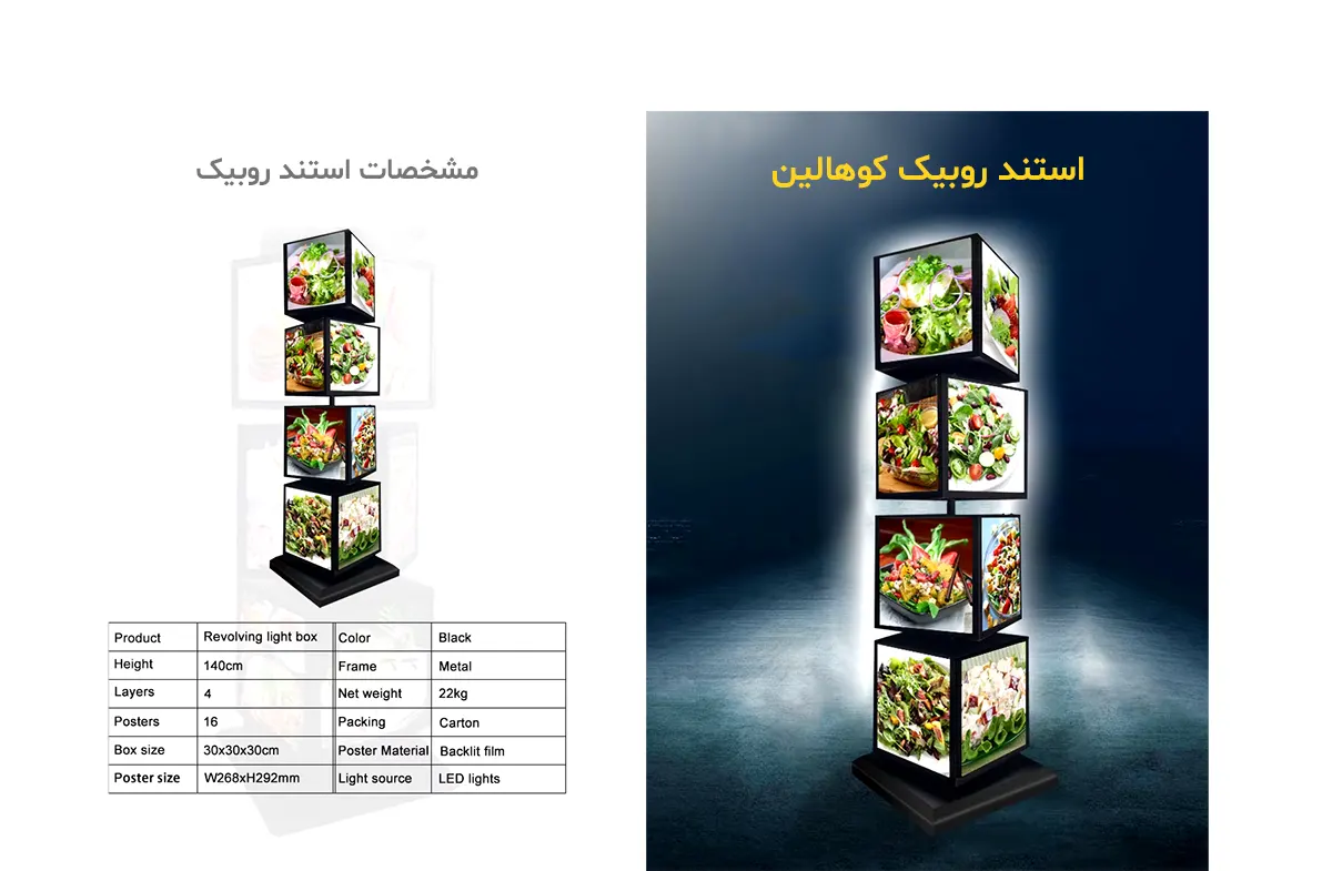 استند تبلیغاتی روبیک هم خوان با طراحی فضاهای داخلی و خارجی جهت استفاده در فروشگاه ها، نمایشگاه ها، کافه ها و رستوران ها و کلیه مشاغلی می باشد که نیاز به ایجاد توجه بصری در مخاطب دارند. این استند متفاوت دارای قابلیت استفاده در نمای داخل و خارج فروشگاه هاست و با قابلیت گردش هر واحد، جلوه بصری بسیار زیبایی به مجموعه شما می دهد و در مدت کوتاهی با جذب مخاطب می تواند موجب بازگشت هزینه اولیه گردد. به چند ویژگی مهم استند روبیک که می تواند به پویایی کسب و کار شما کمک کند اشاره خواهیم کرد. پیشنهاد می کنیم این ویژگی ها را ارزیابی کنید و به ما در توسعه کسب و کارتان اعتماد کنید.