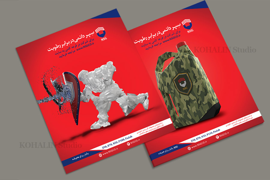 در طراحی پوستر شرکت ان اس جی در استودیو کوهالین، پس از ایده پردازی از روش هویت بخشی و شخصیت دادن به محصول این شرکت استفاده کردیم. با استفاده از مفاهیم مقاوم سازی، عکس تصویر با هویت طرح جنگنده در وسط کادر بصورت بزرگ و چشمگیر استفاده شد.
