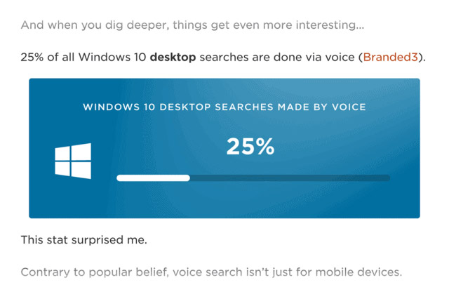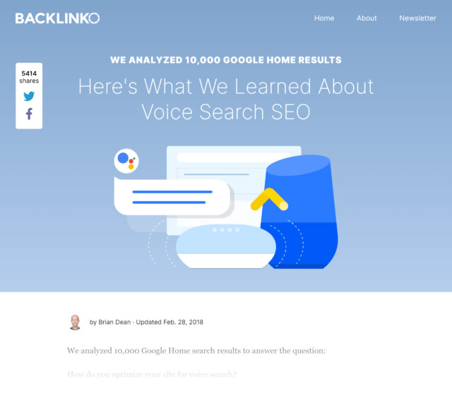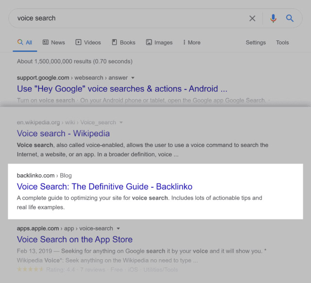 از آنجایی که عبارت «جستجوی صوتی» نسبتاً جدید بود (مخصوصاً در مقایسه با کلمات کلیدی قدیمی مانند « link building »)، مطلب من در عرض یک هفته از انتهای صفحه نخست گوگل بالاتر آمد.
