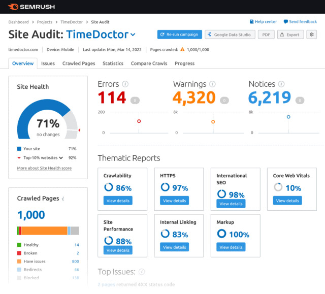 بعد، سایتی را پیدا کردم که در مورد بازاریابی محتوا نوشته بود. و URL صفحه اصلی خود را در ابزار ممیزی سایت Semrush قرار دادم.