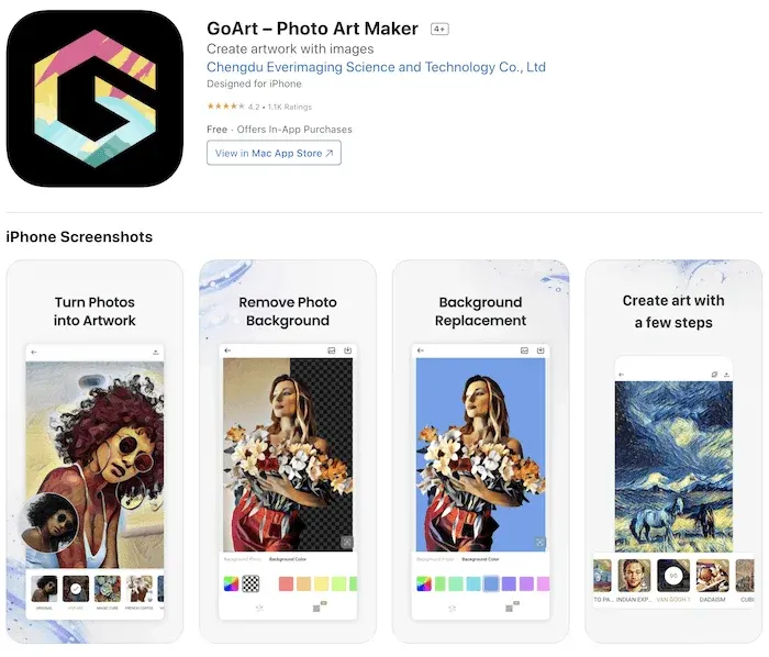 GoArt یک برنامه عالی توسط Fotor برای تبدیل عکس ها به نقاشی است. از فناوری هوش مصنوعی برای خلق آثار هنری بر اساس فیلترهای هنری مختلف استفاده می کند.