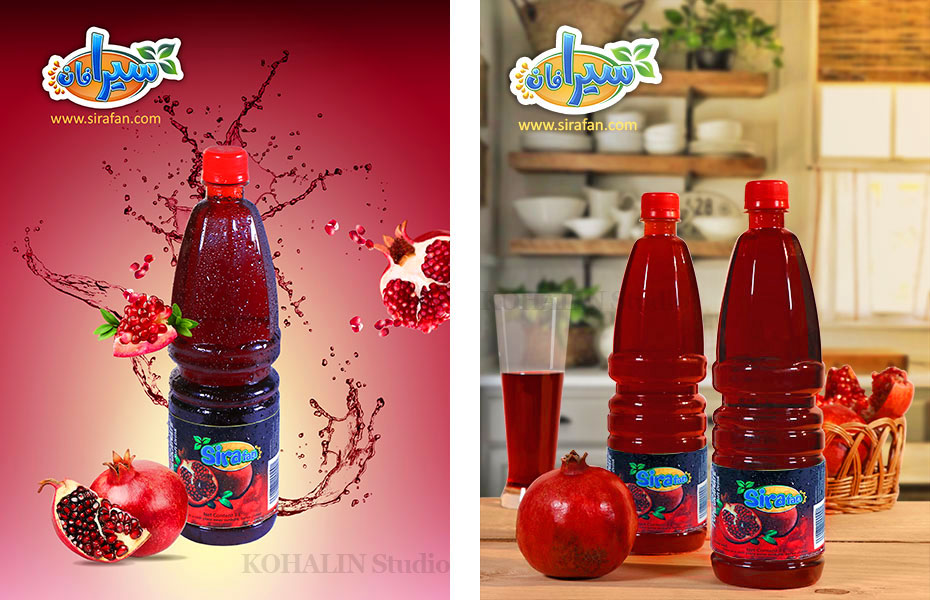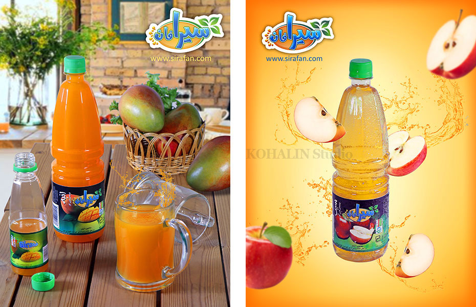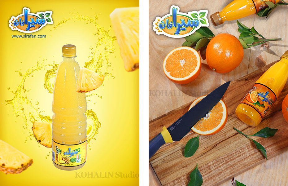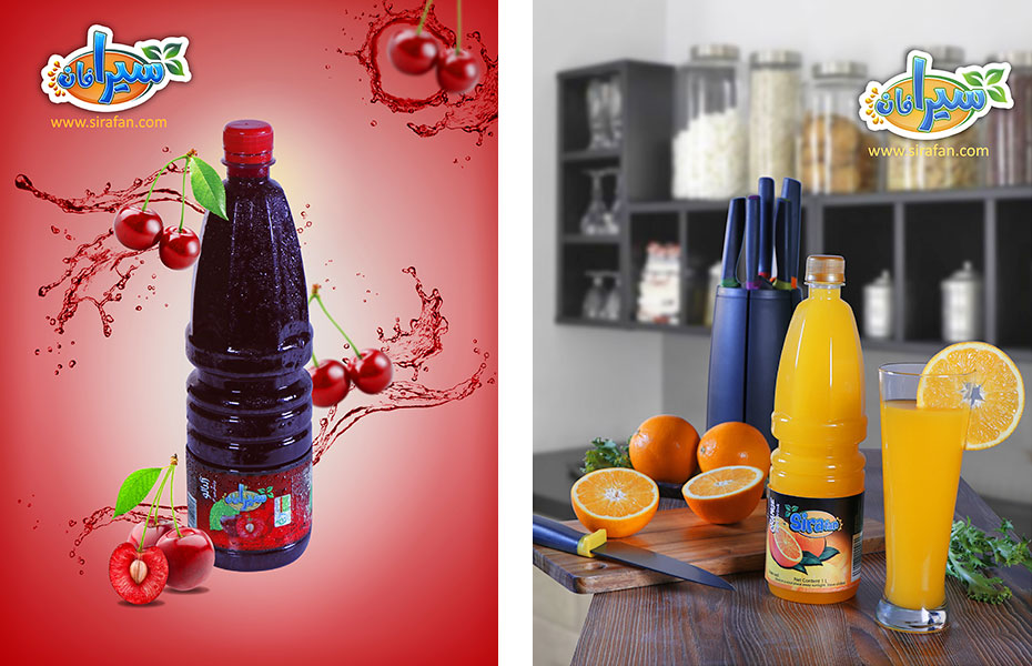 عکاسی تبلیغاتی و چیدمان محصولات آبمیوه طبیعی سیرافان